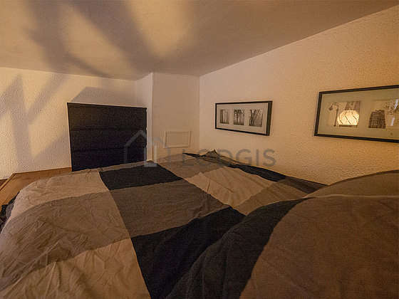 Grâce à une belle hauteur sous plafond, une belle mezzanine a pu être installée dans cet appartement , vous offrant ainsi une vraie pièce en plus équipée de draps, couettes, commode, table de chevet.