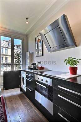 Cet appartement dispose d'une magnifique cuisine avec du parquet au sol et tout l'équipement essentiel pour votre quotidien : plaques de cuisson, réfrigerateur, congélateur, four, hotte, grille pain, bouilloire électrique, cafetière, etagère, placard, vaisselle.