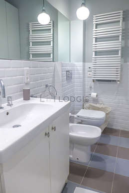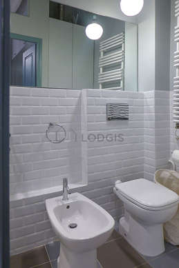 Cet appartement est équipé d'une salle de bain magnifique et très claire. Cette salle d'eau bénéficie du nécessaire pour votre bien-être au quotidien : serviettes de bain, commode, douche séparée, sèche cheveux, lavabo, radiateur sèche-serviettes. Les toilettes sont intégrées dans la salle de bain.