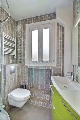 Cet appartement est équipé d'une salle de bain magnifique et claire avec des fenêtres. Cette salle d'eau bénéficie du nécessaire pour votre bien-être au quotidien : serviettes de bain, placard, douche séparée, sèche cheveux, lavabo, radiateur sèche-serviettes. Les toilettes sont intégrées dans la salle de bain.