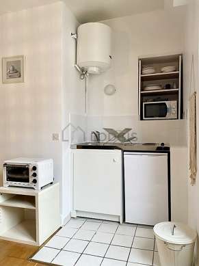 Cet appartement dispose d'une cuisine et tout l'équipement indispensable pour votre quotidien : plaques de cuisson, réfrigerateur, four, micro ondes, placard, vaisselle.