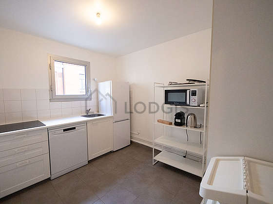Cet appartement dispose d'une magnifique cuisine avec du carrelage au sol et tout l'équipement essentiel pour votre quotidien : plaques de cuisson, réfrigerateur, congélateur, micro onde combiné, bouilloire électrique, cafetière, placard, vaisselle.