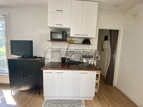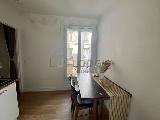 Cet appartement dispose d'une magnifique cuisine avec du parquet au sol et tout l'équipement nécessaire pour votre quotidien : plaques de cuisson, réfrigerateur, four, bouilloire électrique, cafetière, table à manger, etagère, placard, vaisselle, 2 chaise(s).