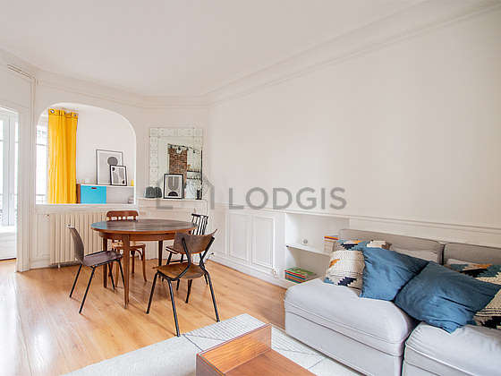 SéjourCet appartement est composé d'un beau salon avec du parquet au sol et des fenêtres double vitrage. Ce salon très calme est meublé et équipé pour rendre votre séjour agréable : télé, canapé, table à manger, table basse, cheminée, 4 chaise(s), meuble tv.