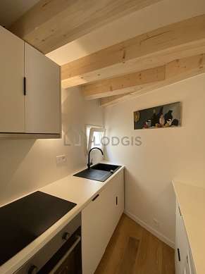 Cet appartement dispose d'une magnifique cuisine avec du parquet au sol et tout l'équipement nécessaire pour votre quotidien : plaques de cuisson, réfrigerateur, congélateur, four, hotte, grille pain, bouilloire électrique, cafetière, placard, vaisselle.