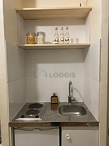 Cet appartement dispose d'une belle cuisine avec du parquet au sol et tout l'équipement indispensable pour votre quotidien : plaques de cuisson, réfrigerateur, micro ondes, etagère, vaisselle.