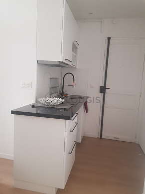 Cet appartement dispose d'une belle cuisine avec du parquet au sol et tout l'équipement nécessaire pour votre quotidien : plaques de cuisson, réfrigerateur, micro ondes, micro onde combiné, table à manger, penderie, etagère, placard, 1 chaise(s).