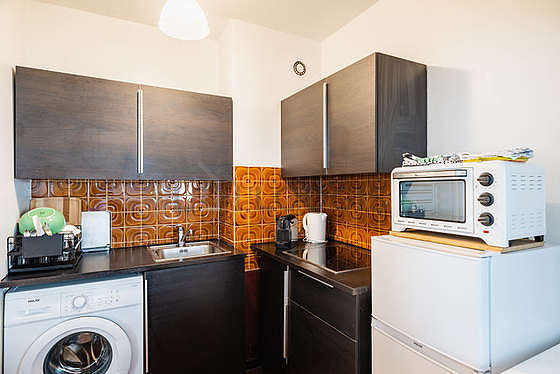 Cet appartement dispose d'une cuisine et tout l'équipement indispensable pour votre quotidien : plaques de cuisson, réfrigerateur, four, freezer, cafetière, etagère, placard, vaisselle, miroir, porte manteaux, porte serviettes, poubelle, tableau, tapis.