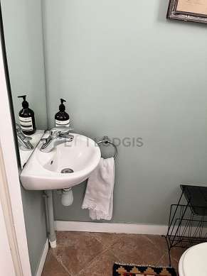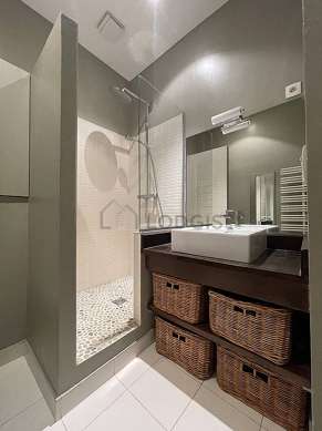 Cet appartement est équipé d'une salle de bain. Cette salle d'eau bénéficie du nécessaire pour votre bien-être au quotidien : douche séparée, lavabo, radiateur sèche-serviettes. Les toilettes sont intégrées dans la salle de bain.