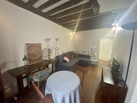 SéjourCet appartement est composé d'un plaisant salon avec du parquet au sol. Ce salon très calme est meublé et équipé pour rendre votre séjour agréable : télé, canapé, table à manger, bureau, etagère, placard, poutre, 3 chaise(s), table de chevet, lampadaire sur pied, lampe, meuble tv, rideaux, spot, tableau1 canapé(s) lit(s) de 140cm.