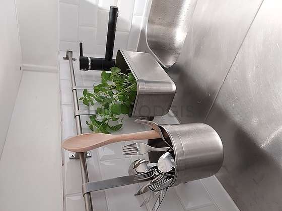 Cet appartement dispose d'une magnifique cuisine avec du parquet au sol et tout l'équipement essentiel pour votre quotidien : plaques de cuisson, réfrigerateur, cafetière, placard, vaisselle, assiettes à dessert, assiettes plates, bol, casserole, couvercle, couverts, cuillère en bois, mugs, planche à découper, poêle, spot, tapis, tasses à café, tasses à thé, verre à eau, verre à vin.