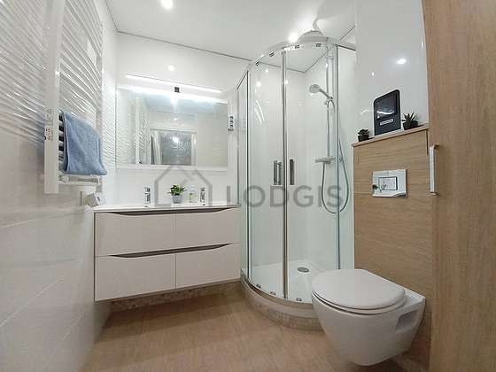 Cet appartement est équipé d'une salle de bain. Cette salle d'eau bénéficie du nécessaire pour votre bien-être au quotidien : placard, douche séparée, lavabo, miroir, radiateur sèche-serviettes, tapis. Les toilettes sont intégrées dans la salle de bain.