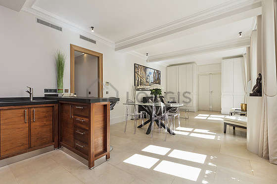 SéjourCet appartement est composé d'un superbe salon avec du carrelage au sol. Ce salon très calme est meublé et équipé pour rendre votre séjour agréable : télé, canapé, 1 fauteuil(s), table à manger, table basse, 4 chaise(s), lampadaire sur pied, meuble tv, rideaux.