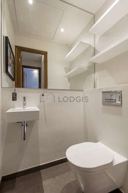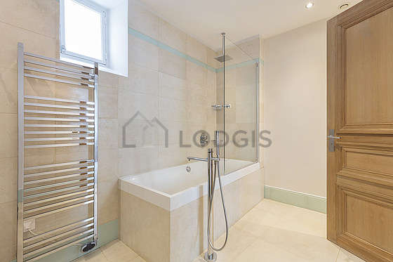 Cet appartement est équipé d'une salle de bain magnifique et très claire. Cette salle d'eau bénéficie du nécessaire pour votre bien-être au quotidien : placard, baignoire, lampe, lavabo, miroir, poubelle, radiateur sèche-serviettes, spot, stores. Les toilettes sont intégrées dans la salle de bain.