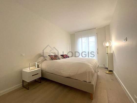 Parc Monceau, 8ème, au 5ème étage avec ascenseur d'un immeuble moderne ravalé avec gardien, un appartement meublé 3 pièces entièrement rénové composé d'une belle entrée avec rangements, un séjour / salle à manger avec cuisine américaine entièrement équipée, deux chambres de bonne taille avec rangements, une salle de bains avec double vasque, toilettes séparées, cave.