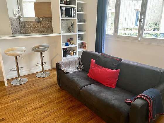 SéjourCet appartement est composé d'un plaisant salon avec du parquet au sol et des fenêtres. Ce salon très calme est meublé et équipé pour rendre votre séjour agréable : table basse, bibliothèque, 1 chaise(s)1 canapé(s) lit(s) de 140cm.