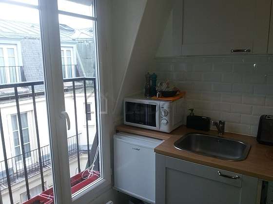 Cet appartement dispose d'une belle cuisine avec du parquet au sol et tout l'équipement indispensable pour votre quotidien : télé, plaques de cuisson, réfrigerateur, congélateur, micro ondes, freezer, hotte, grille pain, bouilloire électrique, cafetière, table à manger, etagère, placard, vaisselle, etendoir, miroir, poubelle.