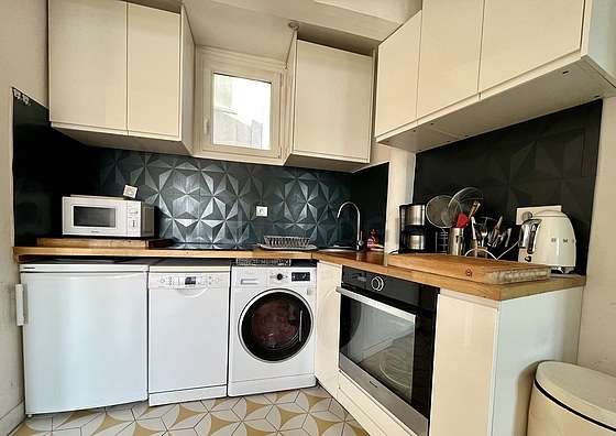 Cet appartement dispose d'une magnifique cuisine avec du carrelage au sol et tout l'équipement essentiel pour votre quotidien : plaques de cuisson, réfrigerateur, four, micro ondes, hotte, bouilloire électrique, cafetière, placard, vaisselle.