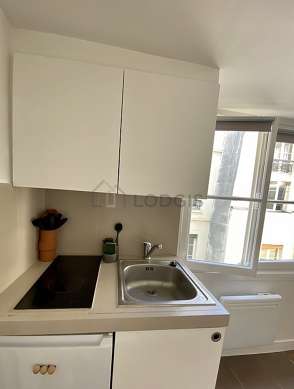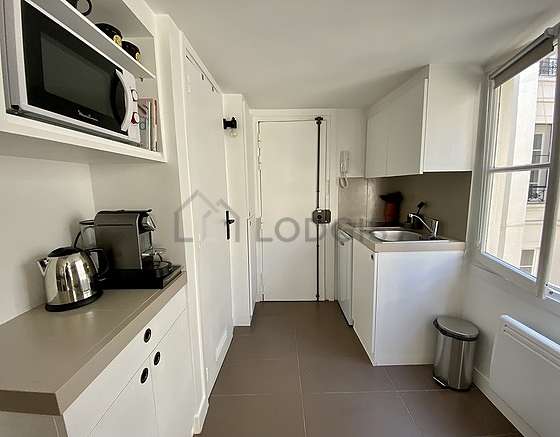 Cet appartement dispose d'une belle cuisine avec du carrelage au sol et tout l'équipement indispensable pour votre quotidien : plaques de cuisson, réfrigerateur, micro ondes, freezer, grille pain, bouilloire électrique, cafetière, etagère, placard, vaisselle.