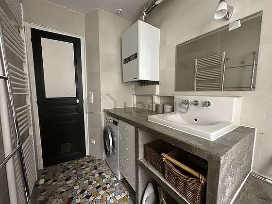 Cet appartement est équipé d'une salle de bain agréable et claire. Cette salle d'eau bénéficie du nécessaire pour votre bien-être au quotidien : serviettes de bain, placard, baignoire, sèche cheveux, etendoir, lavabo, miroir. Les toilettes sont séparées de la salle de bain et situées dans une pièce indépendante.