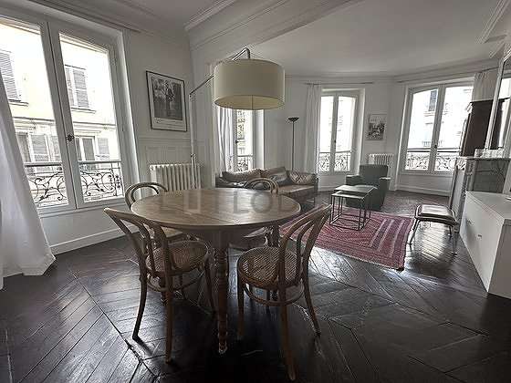 SéjourCet appartement est composé d'un charmant salon avec du parquet au sol et des fenêtres double vitrage. Ce salon calme est meublé et équipé pour rendre votre séjour agréable : télé, draps, couettes, canapé, 1 fauteuil(s), table à manger, etagère, placard, vaisselle, 1 chaise(s), lampadaire sur pied, miroir, tableau, table gigogne, tapis.
