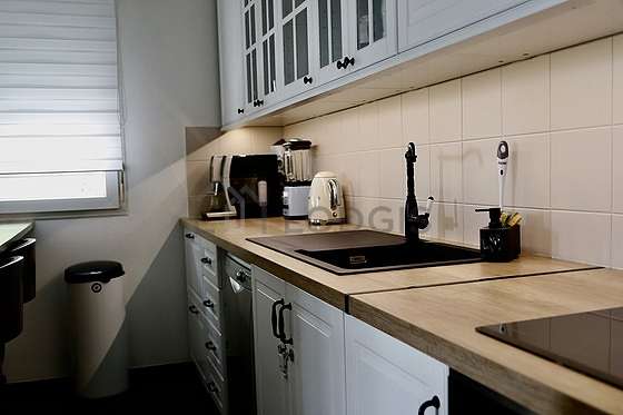 Cet appartement dispose d'une magnifique cuisine avec du carrelage au sol et tout l'équipement indispensable pour votre quotidien : réfrigerateur, congélateur, four, freezer, grille pain, bouilloire électrique, table à manger, commode, vaisselle, 1 chaise(s).