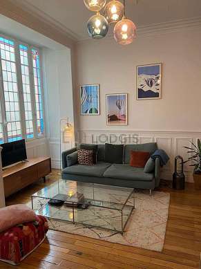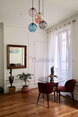 SéjourCet appartement est composé d'un salon des fenêtres double vitrage. Ce salon est meublé et équipé pour rendre votre séjour agréable : télé, canapé, 1 fauteuil(s), table à manger, etagère, buffet, vaisselle, 1 chaise(s), lampadaire sur pied, meuble tv, miroir, pouf, tableau, tapis, vase.