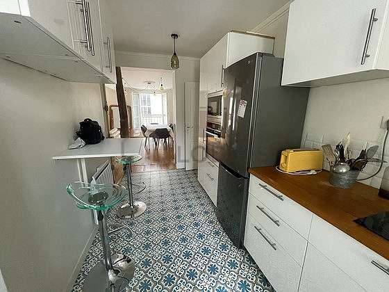 Cet appartement dispose d'une magnifique cuisine avec du carrelage au sol et tout l'équipement essentiel pour votre quotidien : plaques de cuisson, réfrigerateur, four, micro ondes, tabouret.