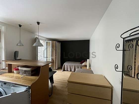 SéjourCet appartement est composé d'un superbe salon avec du parquet au sol et des fenêtres. Ce salon très calme est meublé et équipé pour rendre votre séjour agréable : télé, table à manger, bureau, placard, 1 chaise(s), tabouret, lampe2 lit(s) de 90cm.