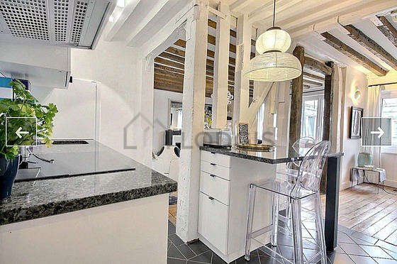 Cet appartement dispose d'une magnifique cuisine avec du carrelage au sol et tout l'équipement nécessaire pour votre quotidien : plaques de cuisson, réfrigerateur, congélateur, four, micro ondes, hotte, grille pain, bouilloire électrique, cafetière, etagère, placard, vaisselle.