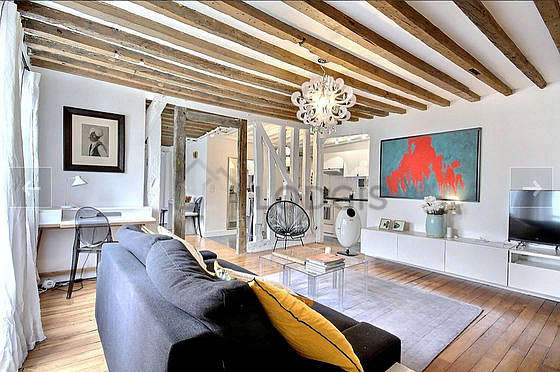 SéjourCet appartement est composé d'un beau salon avec du parquet au sol et des fenêtres. Ce salon très calme est meublé et équipé pour rendre votre séjour agréable : canapé, 1 fauteuil(s), table à manger, table basse, 1 chaise(s), lampadaire sur pied, lampe, tapis.