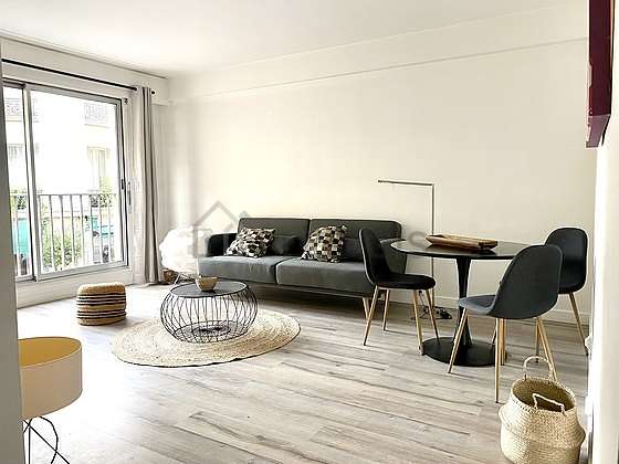 Cet appartement est composé d'un beau salon avec du parquet au sol vue sur rue. Ce salon très calme est meublé et équipé pour rendre votre séjour agréable : télé, canapé, table à manger, table basse, etagère, 1 chaise(s), tabouret, console, lampadaire sur pied, lampe, meuble tv, miroir, porte manteaux, pouf, rideaux, tableau, tapis, vase1 lit(s) de 140cm.