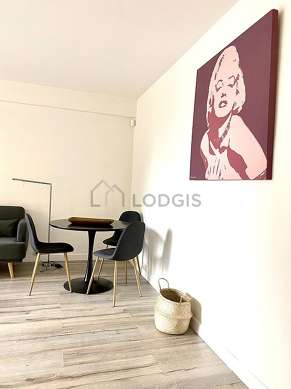 Cet appartement est composé d'un magnifique salon avec du parquet au sol vue sur rue. Ce salon très calme est meublé et équipé pour rendre votre séjour agréable : télé, canapé, table à manger, table basse, etagère, 1 chaise(s), tabouret, console, lampadaire sur pied, lampe, meuble tv, miroir, porte manteaux, pouf, rideaux, tableau, tapis, vase1 lit(s) de 140cm.