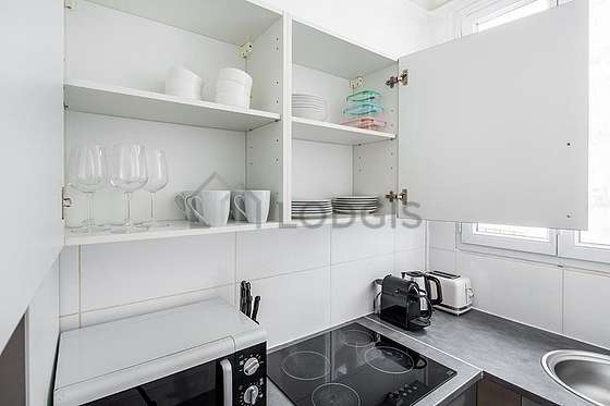Cet appartement dispose d'une magnifique cuisine avec du carrelage au sol et tout l'équipement indispensable pour votre quotidien : plaques de cuisson, réfrigerateur, congélateur, four, micro ondes, hotte, grille pain, bouilloire électrique, cafetière, etagère, placard, vaisselle.