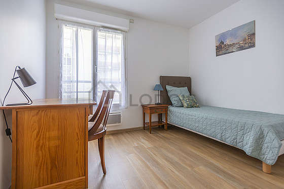 Avec du parquet au sol et des fenêtres double vitrage cette chambre splendide offre l'équipement nécessaire pour vous reposer pendant votre séjour : couettes, bureau, bibliothèque, placard, 1 chaise(s), table de chevet, tableau1 lit(s) de 90cm.