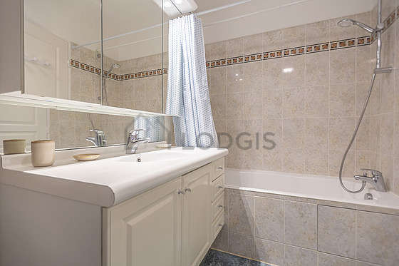 Cet appartement est équipé d'une salle de bain magnifique et très claire. Cette salle d'eau bénéficie du nécessaire pour votre bien-être au quotidien : armoire, baignoire, tabouret, lavabo, miroir, poubelle, radiateur sèche-serviettes, tapis, ventilateur. Les toilettes sont intégrées dans la salle de bain.