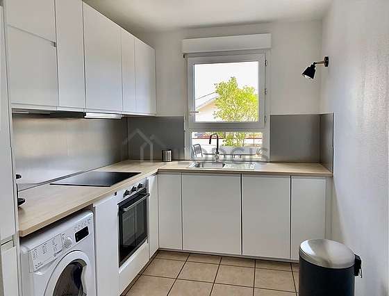 Cet appartement dispose d'une magnifique cuisine avec du carrelage au sol et tout l'équipement essentiel pour votre quotidien : plaques de cuisson, réfrigerateur, congélateur, four, micro ondes, hotte, cafetière, placard, vaisselle.