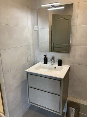Cet appartement est équipé d'une salle de bain. Cette salle d'eau bénéficie du nécessaire pour votre bien-être au quotidien : serviettes de bain, armoire, placard, douche séparée, sèche cheveux, lavabo, poubelle, radiateur sèche-serviettes, ventilateur. Les toilettes sont intégrées dans la salle de bain.