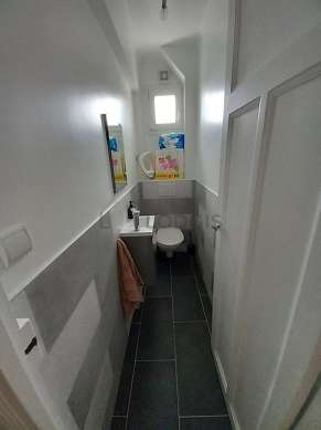 Cet appartement est équipé d'une salle de bain. Cette salle d'eau bénéficie du nécessaire pour votre bien-être au quotidien : serviettes de bain, etagère, placard, douche séparée, lavabo. Les toilettes sont séparées de la salle de bain et situées dans une pièce indépendante.