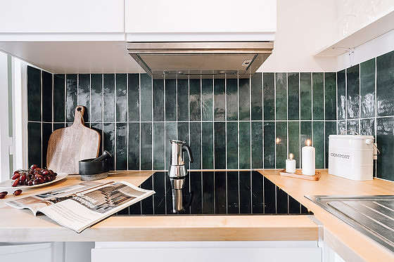 Cet appartement dispose d'une cuisine et tout l'équipement essentiel pour votre quotidien : plaques de cuisson, réfrigerateur, four, placard, vaisselle.