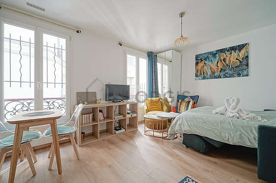 SéjourCet appartement est composé d'un salon des fenêtres double vitrage. Ce salon est meublé et équipé pour rendre votre séjour agréable : télé, draps, couettes, réfrigerateur, canapé, table à manger, bureau, penderie, etagère, armoire, commode, placard, vaisselle, 1 chaise(s), tabouret, etendoir, meuble tv, miroir, poubelle1 canapé(s) lit(s) de 140cm.