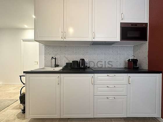 Cet appartement dispose d'une belle cuisine avec du carrelage au sol et tout l'équipement nécessaire pour votre quotidien : plaques de cuisson, réfrigerateur, four, micro onde combiné, freezer, hotte, grille pain, bouilloire électrique, cafetière, placard, vaisselle.