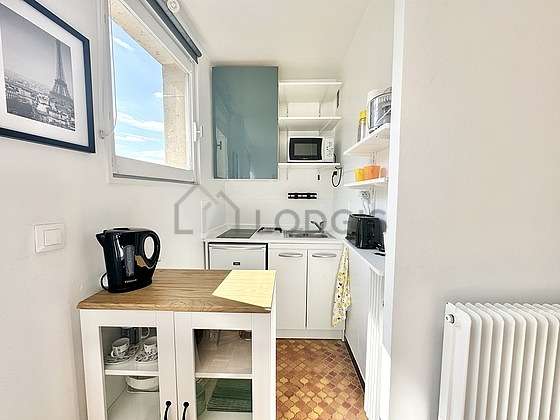Cet appartement dispose d'une belle cuisine avec du parquet au sol et tout l'équipement nécessaire pour votre quotidien : télé, plaques de cuisson, réfrigerateur, micro ondes, freezer, grille pain, bouilloire électrique, cafetière, table à manger, penderie, etagère, armoire, buffet, placard, vaisselle, robot ménager, 1 chaise(s), tabouret, etendoir, lampadaire sur pied, meuble tv, miroir, porte serviettes, poubelle, tableau, table gigogne, tapis, vase, ventilateur.