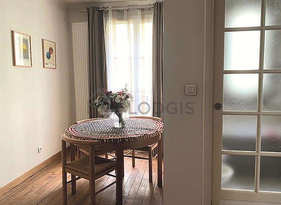 Afin de partager vos repas en toute convivialité pendant votre séjour à Paris, cet appartement dispose d'une salle à manger grâce à table à manger, bibliothèque, etagère, 1 chaise(s), tableau.