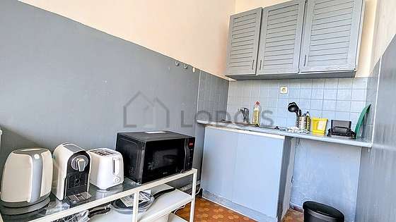 Cet appartement dispose d'une magnifique cuisine avec du carrelage au sol et tout l'équipement indispensable pour votre quotidien : plaques de cuisson, réfrigerateur, micro ondes, grille pain, bouilloire électrique, cafetière, placard, vaisselle.