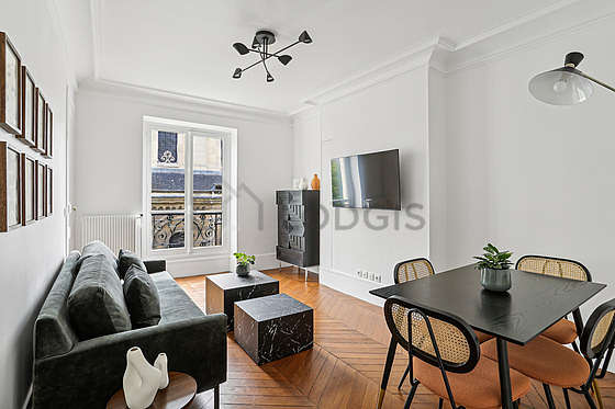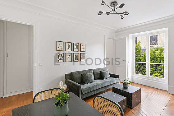 SéjourCet appartement est composé d'un beau salon avec du parquet au sol et des fenêtres. Ce salon très calme est meublé et équipé pour rendre votre séjour agréable : télé, canapé, table basse, commode, 1 chaise(s).