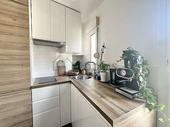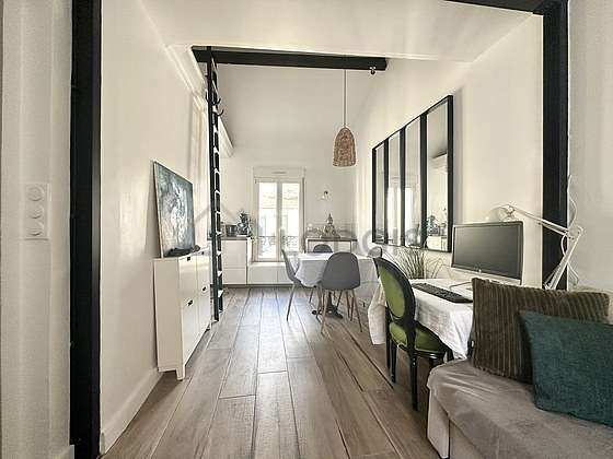 Cet appartement dispose d'une magnifique cuisine avec du parquet au sol et tout l'équipement indispensable pour votre quotidien : plaques de cuisson, réfrigerateur, congélateur, hotte, bouilloire électrique, cafetière, table à manger.