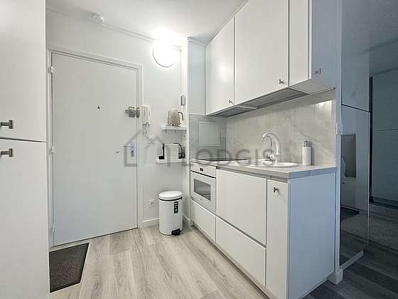 Cet appartement dispose d'une belle cuisine avec du parquet au sol et tout l'équipement nécessaire pour votre quotidien : plaques de cuisson, réfrigerateur, congélateur, four, micro onde combiné, bouilloire électrique, cafetière, placard, vaisselle.