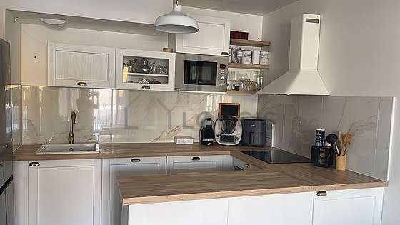 Cet appartement dispose d'une belle cuisine avec du carrelage au sol et tout l'équipement nécessaire pour votre quotidien : plaques de cuisson, réfrigerateur, congélateur, micro onde combiné, hotte, cafetière, placard, vaisselle, bar.