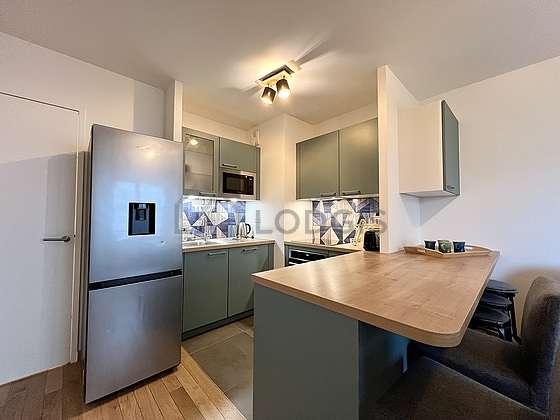 Cet appartement dispose d'une cuisine et tout l'équipement nécessaire pour votre quotidien : plaques de cuisson, réfrigerateur, congélateur, four, micro onde combiné, hotte, grille pain, bouilloire électrique, cafetière, placard, vaisselle, casserole, couverts, lavabo, poêle, set de table, tasses à café, verre à champagne, verre à eau.
